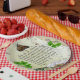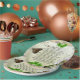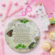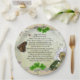 Ein beigefarbener Rahmen mit Blume, Schmetterlingen und Kleeblatten enthält einen irischen Haussegen. "Segen Sie dieses Haus o Herr, wir beten. Machen Sie es bei Nacht und Tag sicher. Segen Sie diese Wände so fest und steh, Behalt woll und Ärger aus. Segen Sie das Dach und den Kamin hoch, Lass dir die Ruhe über alles. Segen Sie die Türen, die sie sich für immer öffnen können, um Freude und Liebe zu erleben. Segen Sie die Fenster leuchten hell, Lassend in Gottes himmlischem Licht. Segen Sie das Herz, das dort a strahlt, wobei Rauch wie ein Gebet aufsteigt. Die Menschen hier drinnen segnen"