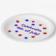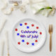 Text zeigt "Feiert am 4. Juli!" in Rot, Weiß und Blau mit blauen und roten Sternen im Hintergrund.