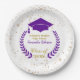 Papier Teller für das spezielle High School oder Uni-Abschluss Party mit personalisiertem Text. Features Bild eines lila Grades und Lorbeerkranz Akzent mit Imitaten goldenen Konfetti. Siehe passende Servietten und andere Farbgruppen auch in diesem Design verfügbar
