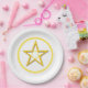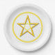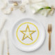 Stern in drei Dimensionen, sitzt in der Mitte der Platte. Der gelbe Stern hat einen hellgelben Kreis, der sich im Inneren befindet, und der dunkelgelbe Kreis verläuft um den äußeren Rand der Platte herum.