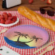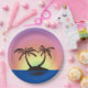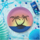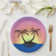 Schwarze Silhouette von zwei Palmen auf der kleinen Insel. Die Sonne liegt hinter der Insel. Himmel in Purpur und Rot mit Gelb der untergehenden Sonne. Dunkelblaues Wasser mit Schatten der Insel im Vordergrund. Original Kunst von Deanna Pendrick.