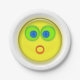 Gelbes Gesicht, grüne Augen mit blauen Schülern und roter Mund im offenen Schock. Das Gesicht mit überraschtem Aussehen wird den Benutzer begrüßen, wenn die Platte geräumt ist. Dreidimensionaler Blick.