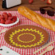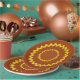 Konzentrische Kreise in Zickzack-Linie sind von Mitte bis Rand der Platte angeordnet. Das Muster ist gelb/gold, der Hintergrund braun. Ändern Sie das Aussehen, indem Sie die Hintergrundfarbe anpassen.