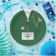 Teller der Creative Medical School mit grünem Hospital-Peeling, Stethoskop und Schweizer Armeemesser. Um für den Arzt personalisieren, bearbeiten Sie Text, um den Namen hinzuzufügen.