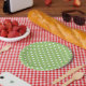 Die Teller sind mit grünen und weißen Polka-Punkten bedruckt.
