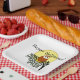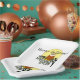 Die Eule sitzt auf dem Ast vor Vollmond. zeichnend Cartoon. Der Vogel ist braun mit weißem Gesicht und gelben Füßen, gelber Mond mit goldenen Kanten und Ast ist schwarze Silhouette. Text "Happy Halloween!" geschrieben über den gelben Mond.