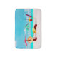 Drei Paprikaschoten mit rotem Chili am Strand. Sonniger Tag, blaues Meer, weißer Sand, Sonnenschirme und Sombreros. Zwei Paprikaschoten sind unter Strandschirmen schläfrig, die dritte im Wasser. Jede Stunde ist eine fröhliche Stunde am Strand. Sonne, Meer, Sand, Sombrero. Horizontale, landschaftlich orientierte Produkte und Souvenirs