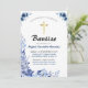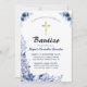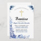 Elegante Flores y Cruz Para Niño Bautizo Einladung Celebre el bautismo de su hijo con amigos y familiares invitándolos con esta elegante invitación de bautismo floral en azul dorado y verde azulado. Este erkranko presenta una hermosa cruz de oro con un marco floral azul sobre un fondo blanco simple. Personaliza el texto y la fuente a tu gusto.