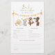 Eine Babyvorhersage und Ratenkarte, die zu unseren Einladungen "Woodland Animals Band Parade Niedlich Baby Shower" passen. Dieses Design zeigt eine marschierende Gruppe von Waldtieren spielen alle Arten von Instrumenten, über ihnen gibt es boho bunting in den Tönen von grün, gelb, rosa, blau und orange. Die Gäste können ihre Geburtsvorhersagen, Ähnlichkeitsvorhersagen und Ratschläge für die neuen Eltern schreiben. Sehen Sie sich die auf dieser Seite verlinkte Sammlung an, um Produkte zu koordinieren.