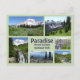 Postkarte mit Fotos, die im Paradies im Nationalpark des Berges Rainier aufgenommen wurden. Umfasst Fotos des Paradise Inn, Myrtle Falls, Wildblumen und Ausblicke auf Rainier und die Tatoosh Range.