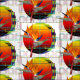 Paradiesvogel Pflanze der Blume (Strelitzia) auf geometrischem Sonnenuntergang. Entworfen durch Paillette träumt Studio.