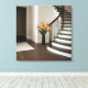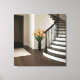 Ein luxuriöser Innenbereich mit einer hübsch geschwungenen Treppe und einer eleganten schwarzen Vase mit einem lebendigen Bird of Paradise-Blume