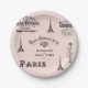 Der Eiffel-Turm, Paris in der Vintagen Typografie und Vintage französische Aufkleber für feine Weine, Champagner und Kakao auf einem weichen rosa Hintergrund stellen eine reizende und interessante Papierplatte her. Zusammenpassende Einzelteile und andere Vintage französische Designs sind in meinem Zazzle Speicher verfügbar.