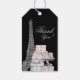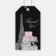 Paris Geschenketiketten mit hübschem Eiffelturm und rosa und graue Geschenke und High Heel Schuhe auf einem hübschen schwarzen Hintergrund. Sie können diese eleganten Pariser Geschenketiketten für Ihre Veranstaltung anpassen, indem Sie einfach den Text Ihrer Wahl hinzufügen. Sie können auch die Hintergrundfarbe ändern.