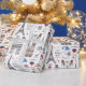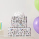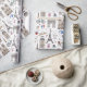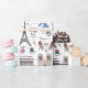 Whimsical Geschenkpackung hat ein handgezeichnetes Muster, das Doodles aller Dinge in Paris zeigt, vom Eiffelturm und Arc de Triomphe bis zu Bistrostühlen und Makaronen.