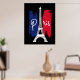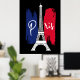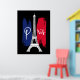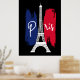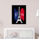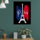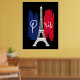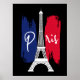 Stilvolles, künstlerisches Design mit dem Eiffelturm und kräftigen blauen und roten Pinselstrichen, das das Wort "Paris" in moderner, handgeschriebener Schrift zeigt.