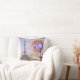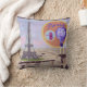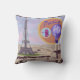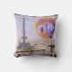 Dies ist ein Gemälde des Stadtbildes von Paris, Frankreich, mit dem Eiffelturm, in dem das Wort Paris, ein rosa Poodle und ein Heißluftballon von Kristie Hubler für dieses Kissen vorgestellt werden
