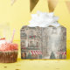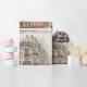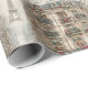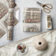 romantic Paris winter Christmas street scene illustrated in a soft painterly storybook style, elegant Haussmann buildings decorated with red garlands, wreaths, and ribbons, gently falling snow, evergreen Christmas trees with red ornaments and bows, warm glowing shopfronts with striped awnings, subtle repeating Eiffel Tower silhouettes partially obscured by snowfall, bare winter trees dusted with snow, cozy nostalgic European holiday atmosphere.