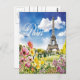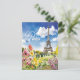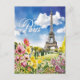 Ein Aquarellbild des Eiffelturms in Paris, Frankreich, mit farbenfrohen Blume im Vordergrund.