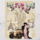 Dieses Scrapbook-Papier-Design bietet Collage of Paris Eiffel Tower, London Bridge, Blumenladen, antikes Auto und eine hübsche Dame auf dem Musiknoten Hintergrund.