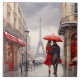 "romantic couple walking street", "paris france eiffel tower", "travel tourist shopping shops", "classic iconic famous landmark", "in love with romance", "snowy winter snow walk", "cold wintery snowing painting", "red dress and awning", "french parisian city walks", "europe umbrella vacation souvenir"