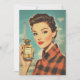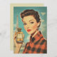 Ein glamouröses Vintage-Poster der 1950er Jahre mit einer raffinierten, roten Frau, die eine luxuriöse Parfümflasche mit der Aufschrift "PERFUME" trägt. Im Hintergrund erhebt sich der Eiffelturm, der die schicke Pariser Ästhetik mit kühnen Farben, Retro-Mode und klassischer Schönheit verstärkt.
