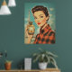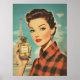 Ein glamouröses Vintage-Poster der 1950er Jahre mit einer raffinierten, roten Frau, die eine luxuriöse Parfümflasche mit der Bezeichnung "PARFUM" trägt. Im Hintergrund erhebt sich der Eiffelturm, der die schicke Pariser Ästhetik mit kühnen Farben, Retro-Mode und klassischer Schönheit verstärkt.