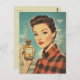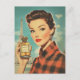 Ein glamouröses Vintage-Poster der 1950er Jahre mit einer raffinierten, roten Frau, die eine luxuriöse Parfümflasche mit der Aufschrift "PERFUME" trägt. Im Hintergrund erhebt sich der Eiffelturm, der die schicke Pariser Ästhetik mit kühnen Farben, Retro-Mode und klassischer Schönheit verstärkt.