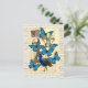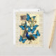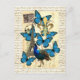 Hübsche elegante romantische feminine digitale Collage eines Pfauenvogels und blauer Schmetterlinge und Eiffelturm , Paris, Frankreich auf einem Vintagen Papier Postkartenhintergrund und französische Briefmarke mit Goldfleur de lys. Copyright Oconnart