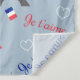Nahtlose Pariser Textsanleitung mit Eiffelturm, dreifarbigen Herzformen und französischer Flaggendekoration auf blauem Hintergrund zum Valentinstag