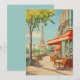 Ein charmantes Pariser Straßencafé mit Rattanstühlen und roten Markisen, Set gegen einen klaren, blauen Himmel und einem atemberaubenden Blick auf den Eiffelturm. Die üppige Vegetation und die blühenden Blume runden dieses idyllische Ambiente perfekt ab für Liebhaber der uralten Reisekunst.