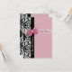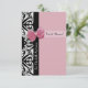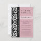 Ein Porträt-Stil 3,5" x 5" elegante rosa und schwarz Pariser Stil Einladung mit trendigem schwarz-weißen Damast und einem schicken rosa Band um einen femininen rosa Spitzen Hintergrund. Personalisieren Sie Ihre Gäste zu besuchen.