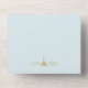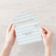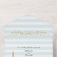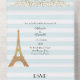 Moderne gestreifte Hochzeit Paris thematisch dreileitige Einladung in hellen aqua-weißen Streifen Muster, mit Grafik Gold Schnörkel und ein goldglänzend aussehender Eiffelturm. Personalisieren Sie den benutzerdefinierten Text für Ihren besonderen Tag.