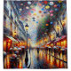 Dieses lebendige Design vereint einen regnerischen Tag in Paris, Frankreich, mit einer charmanten Straßenszene. Die Kopfsteinpflasterstraße ist nass, was die Beleuchtung der Schaufenster und der Straßenlampen widerspiegelt und das Ambiente zusätzlich verstärkt. Zahlreiche farbenfrohe Sonnenschirme schweben über der Straße und schaffen ein skurriles Baldachin. Pariser mit Sonnenschirmen schlendern die Straße hinab und tragen so zu einer lebhaften und dennoch ruhigen Atmosphäre bei. Im Hintergrund befindet sich die Pariser Architektur, die die romantische und malerische Qualität der Szene verbessert. Dieses Kunstwerk verbindet den Charme von Paris mit der Schönheit eines regnerischen Tages und macht es zu einer perfekten Ergänzung zu jeder Dekoration. Die aufwändigen Details und die lebhaften Farben schaffen eine optisch ansprechende und harmonische Komposition, die ideal ist, um jedem Raum eine Touch Pariser Eleganz hinzuzufügen.