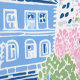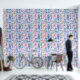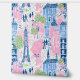 Ein nahtloses Muster mit einer belebten Straße in Paris und dem Eiffelturm im Hintergrund, in einem handgezeichnet, prächtigen Stil mit rosa, blauen und grünen Akzenten auf weißem Hintergrund dargestellt. Das Design vereint die lebendige und skurrile Essenz des Pariser Lebens mit lebhaften Farben und faszinierenden Details.