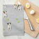 Dieses charmante Parson/Jack Russell Küchenhandtuch verfügt über 13 illustrierte JRTs/PRTs mit verschiedenen braunen und schwarzen Kopf- und Körpermarkierungen sowie 13 zufällig zerstreute Tennisbälle auf einem hellgrauen Hintergrund mit überlappenden geometrischen Spritzer Quadrate Akzent Muster in Weiß - jeder Hund hat eine charmante Kopfneigung - mit Namen und monogramm - Jack - Russell Terriers with tennis balls © katz_d_zynes 2020