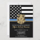 Ehre den Einsatz und die harte Arbeit eines neuen Strafverfolgungsbeamten mit dieser anpassbaren Einladung des Abschlusses. Dieses Design mit einem polizeilichen Abzeichen und einer Polizeifahne mit fett schwarz-weiß Streifen und einer stolzen blauen Linie symbolisiert Stärke, Service und Opfer. Die Einladung ist personalisiert mit dem Namen des Absolventen in Goldschrift, was es zu einem unvergesslichen Sake für Freunde, Familie und Kollegen macht. Ideal, um einen Abschluss, eine Werbeaktion oder einen Meilenstein in der Karriere eines zukünftigen Offiziers zu feiern. Laden Sie Ihre Gäste stilvoll ein und zeigen Sie Unterstützung für das neueste Mitglied der Thin Blue Line Community.