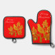 Ein festliches Ofen Mitt und Topfhalter-Set, mit einem Bild eines Patrons in einer Birne. Das Bild hat einen goldenen Imitat-Effekt und ist auf einem kontrastierenden roten Hintergrund. Die Worte "Frohe Weihnachten" sind in weißer Schrift über dem Bild auf beiden Elementen. Ein ideales Urlaubsgeschenk für die Zuhause.