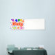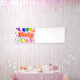 Ein 2,5'x8' Banner im Innenbereich, Zeichnung/Design, mit dem Wort=Party, in den Farben Rot und Weiß, mit einigen farbenfrohen Luftballons, Konfetti und Geschenkpaketen, =(Zeichnung/Design von P.J.M.) in der linken Ecke.