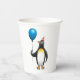 Der niedliche Pinguin hält einen blauen Ballon mit seinen Fäustern. Der Pinguin trägt einen rot-weiß gestreiften Party Hut für die Geburtstagsparty.