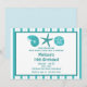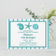 Diese lustige Party Einladung am Strand verfügt über eine Muscheln und einen Sternenfisch und anpassbaren Text auf einem aquamarinen und weiß gestreiften Hintergrund.