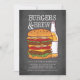 Moderne und unterhaltsame Chalkboard-Burger & Bräu-Barbecue-Einladung mit einer Bierflasche mit einem riesigen Hamburger-Set auf schwarzem Kalkbretboden und einem passenden roten Schachbrett-Tuch für eine besondere Touch. Beliebter Burger laden für all Ihre Sommer Grillen Party zusammen.