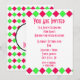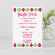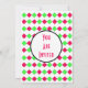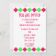 Eine einfache Einladung mit einem warmen rosa und grünen Design der Raute über den oberen und unteren Rand und solides Design auf der Rückseite. Retro rosa Text. Passen Sie Ihre Wünsche an. Gegenüber der Seite befindet sich ein solides Design mit einer kreisförmigen Form in der Mitte und einem eingerahmten Text.