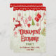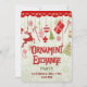 Delikater Snowflake-Hintergrund mit festlich hängenden Feiertagsschmuck und skallopierter Bannergrenze. Deep red Text art typography sagt Ornament Exchange mit anpassbarem Datum unten. Matching Card Back hat eine Textvorlage bereit, mit der Sie Ihre Party-Informationen zum Austausch von Ornamenten hinzufügen können.