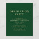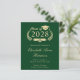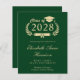 Moderne, preisgünstige grüne Uni-Abschluss Party Einladung. "Class of" ist in einer Illustration eines Goldlaubelkranzes mit einem Gradkappenoberteil und Diplom und dem Namen des Absolventen in einem eleganten goldenen Drehbuch. Fügen Sie ihre Schule, Dur, Ehren oder künftige Pläne und das Graduiertenstudium Einzelheiten in einfachen Typografie.