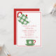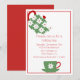 Die Party Einladung des Holiday Tees in Weiß mit einem roten Rahmen um den Außenrand und die Grafik einer grünen Teekanne und einer Tasse Tee mit weißen Poinsettias. Personalisieren Sie den festlichen Roten Text, um Ihre Tee-Party-Bedürfnisse Anzug.