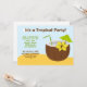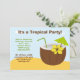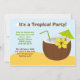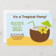 Diese tropische Party Einladung ist ideal für eine Geburtstagsfeier, ein luau, oder jederzeit Ihr Party hat ein tropisches Tipp-Thema. Ein Cocktail in einer Kokospalme mit einer schönen Hibiskus-Blume und Stroh, am Strand unter einem blauen Himmel mit Wolken.