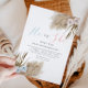 Boho und moderne Gender zeigen eine Party Einladung-Karte mit Aquarellbildern von Pampasgras mit rosa und blauen Blumen. Ideal für ein Gender-Enthüllungs-Party im Sommer.