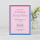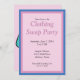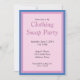 Mit deiner aktuellen Kleidung gelangweilt? Planen Sie ein Bekleidungs-Swap-Party? Mit dieser Einladung können Sie Ihre persönlichen Daten, Daten und UAWG eingeben. Auf der Rückseite ist ein Bild von einem Kleid und einem Rock. Die Farbe der Karte ist rosa und blau.