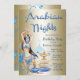 Arabische Nächte Party Einladungen mit wunderschönen, blauen und goldenen Illustrationen auf hellgoldenem Hintergrund. Diese wunderschöne arabische Nachtparty und Veranstaltungseinladung lässt sich einfach an Ihre Veranstaltung anpassen, indem Sie einfach Ihre Details hinzufügen. Dies ist ein gedrucktes Design ohne echten Glitzer, Folie, etc.